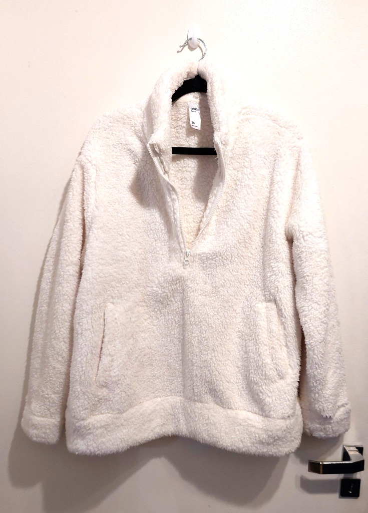 Iso pehmeä ja lämmin valkoinen pusero Koko: Australia 14 - Euro L (40/42) pituus n. 70cm Ominaisuudet: Taskut edessä missä voi lämmittää kädet Materiaali: 100% polyesteri