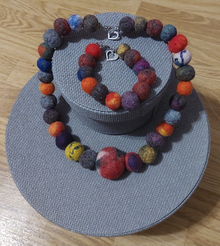 Värikäs huopa kaulakoru ja rannekoru Kaulukorun halkaisija n. 20cm Rannekorun halkaisija n. 6cm